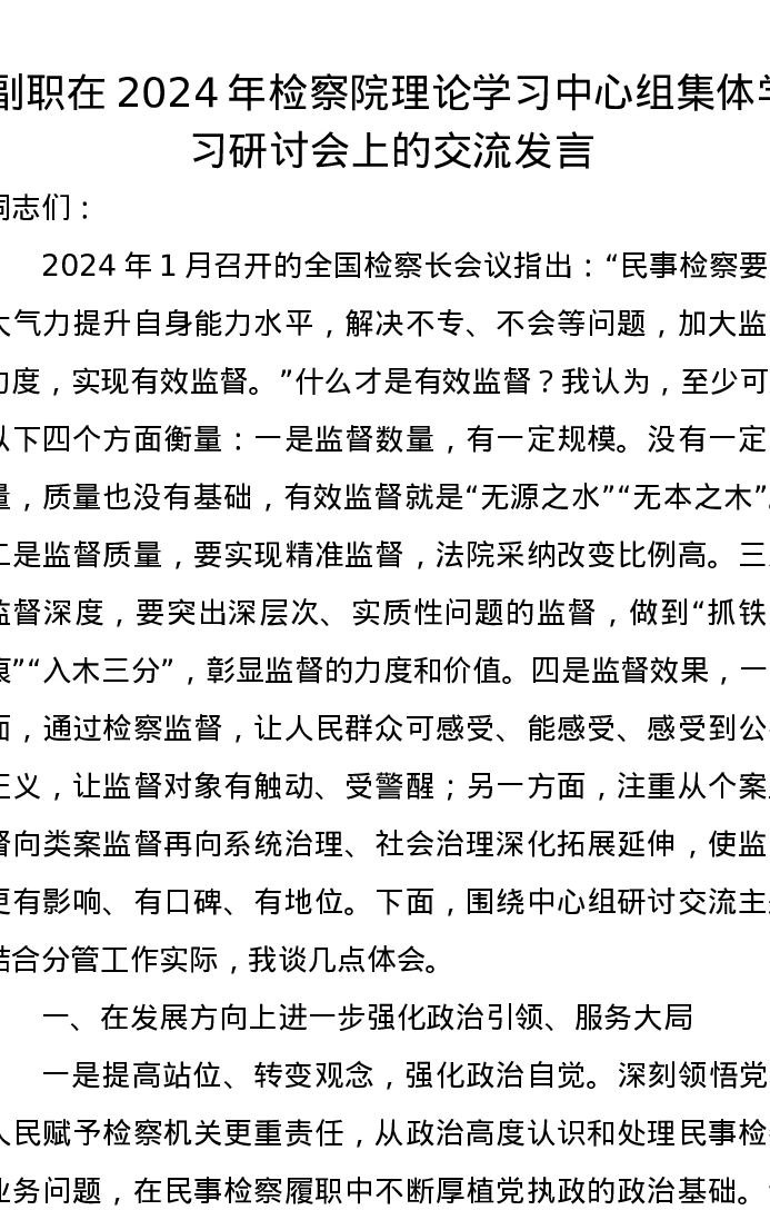 副职在2024年检察院理论学习中心组集体学习研讨会上的交流发言