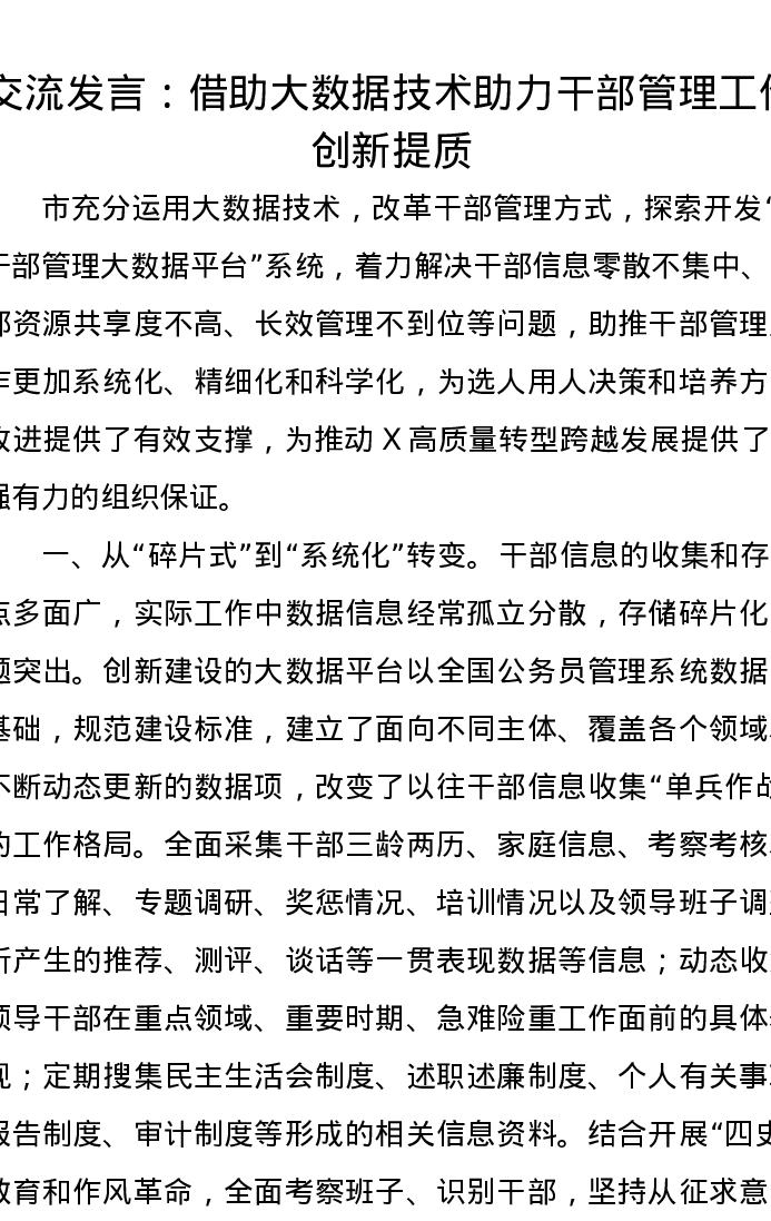 交流发言:借助大数据技术助力干部管理工作创新提质
