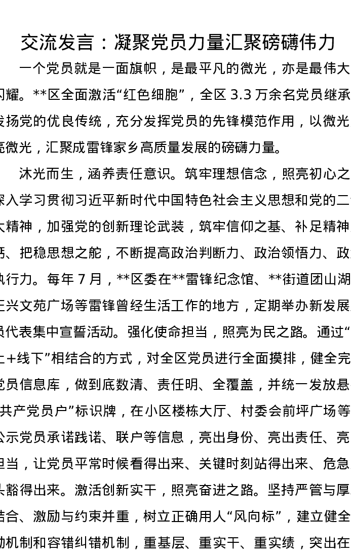 交流发言:凝聚党员力量汇聚磅礴伟力