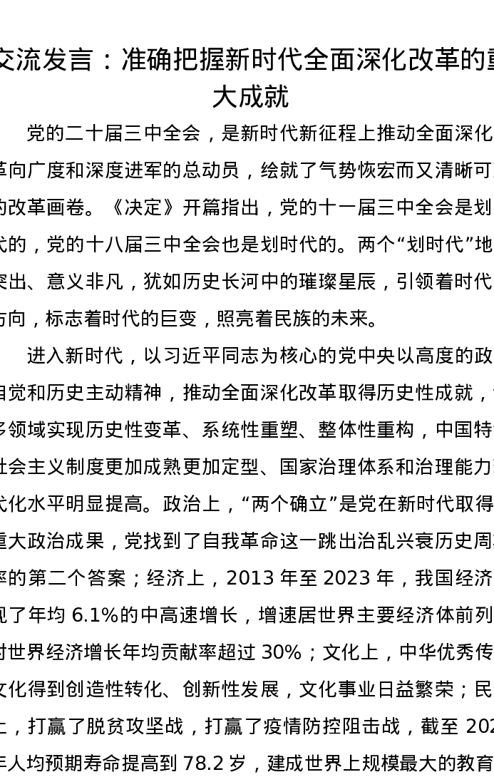 交流发言:准确把握新时代全面深化改革的重大成就
