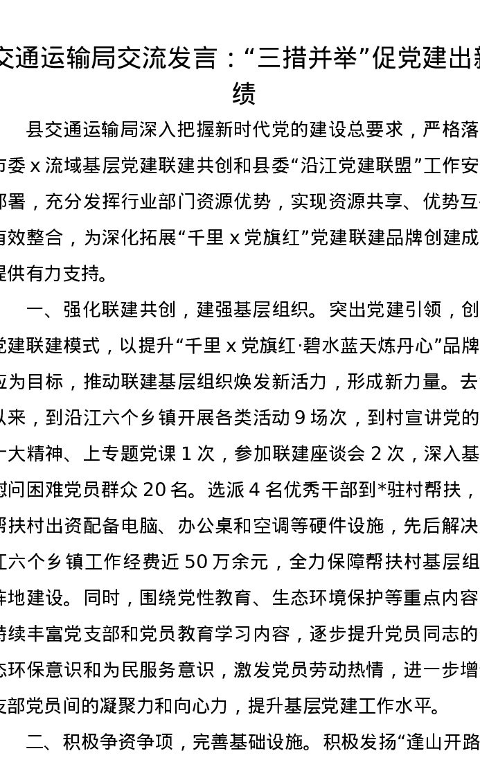 交通运输局交流发言:“三措并举”促党建出新绩
