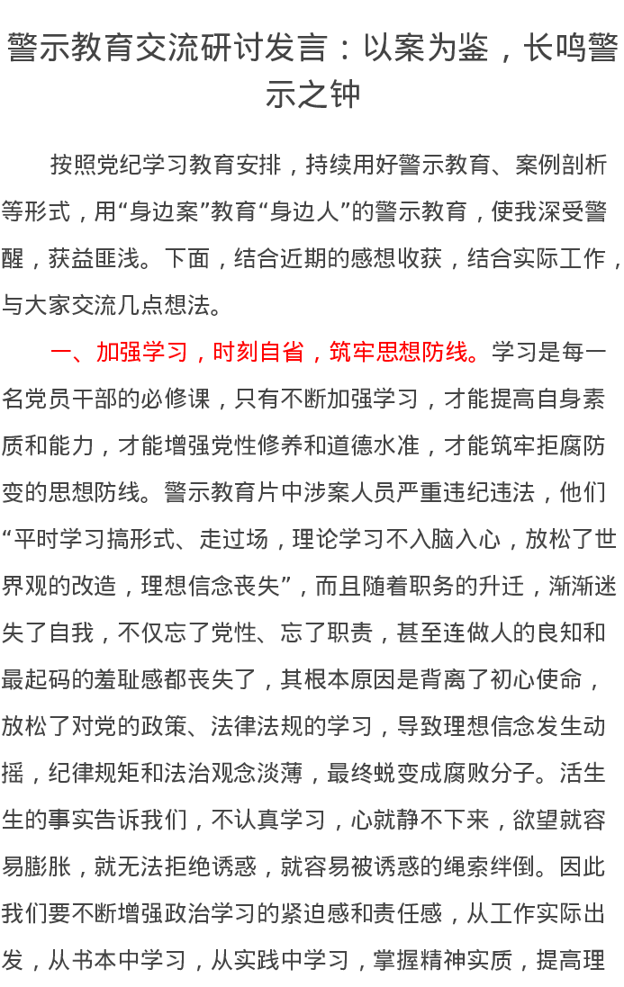 警示教育交流研讨发言:以案为鉴,长鸣警示之钟
