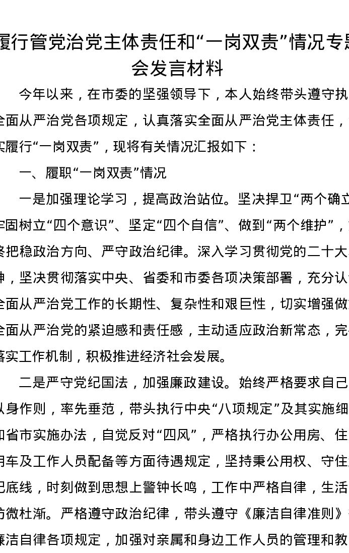 履行管党治党主体责任和“一岗双责”情况专题会发言材料