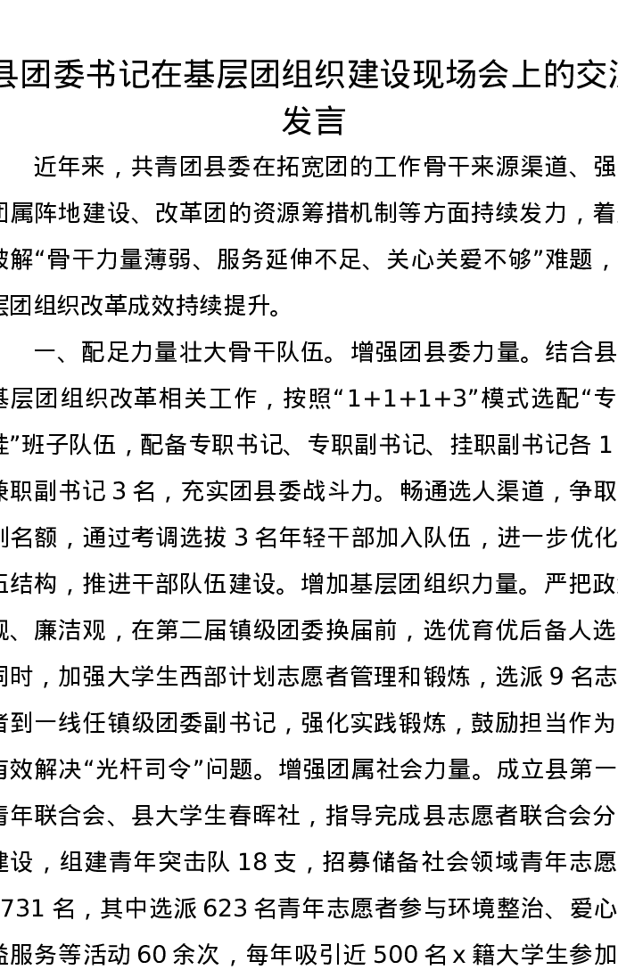 县团委书记在基层团组织建设现场会上的交流发言