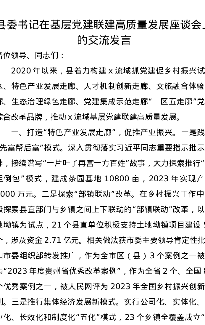 县委书记在基层党建联建高质量发展座谈会上的交流发言