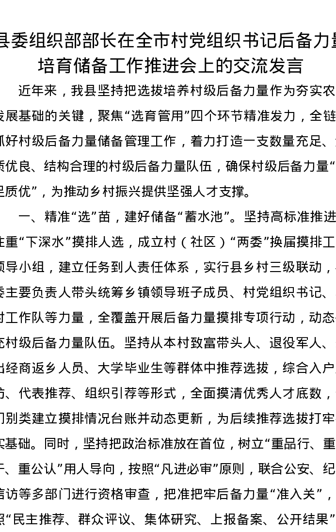 县委组织部部长在全市村党组织书记后备力量培育储备工作推进会上的交流发言