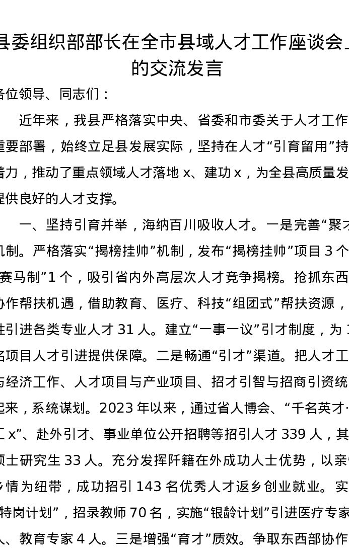 县委组织部部长在全市县域人才工作座谈会上的交流发言