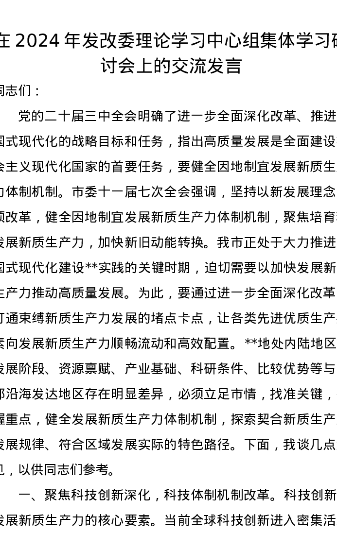 在2024年发改委理论学习中心组集体学习研讨会上的交流发言