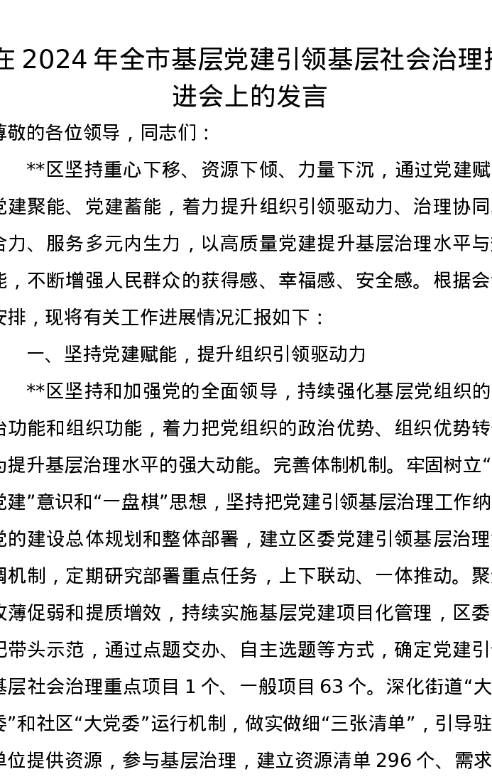 在2024年全市基层党建引领基层社会治理推进会上的发言