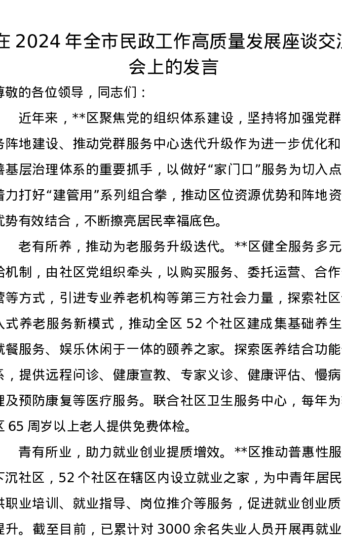在2024年全市民政工作高质量发展座谈交流会上的发言