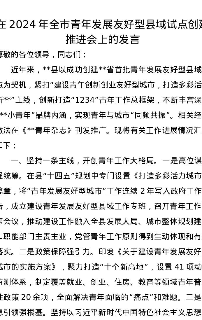在2024年全市青年发展友好型县域试点创建推进会上的发言