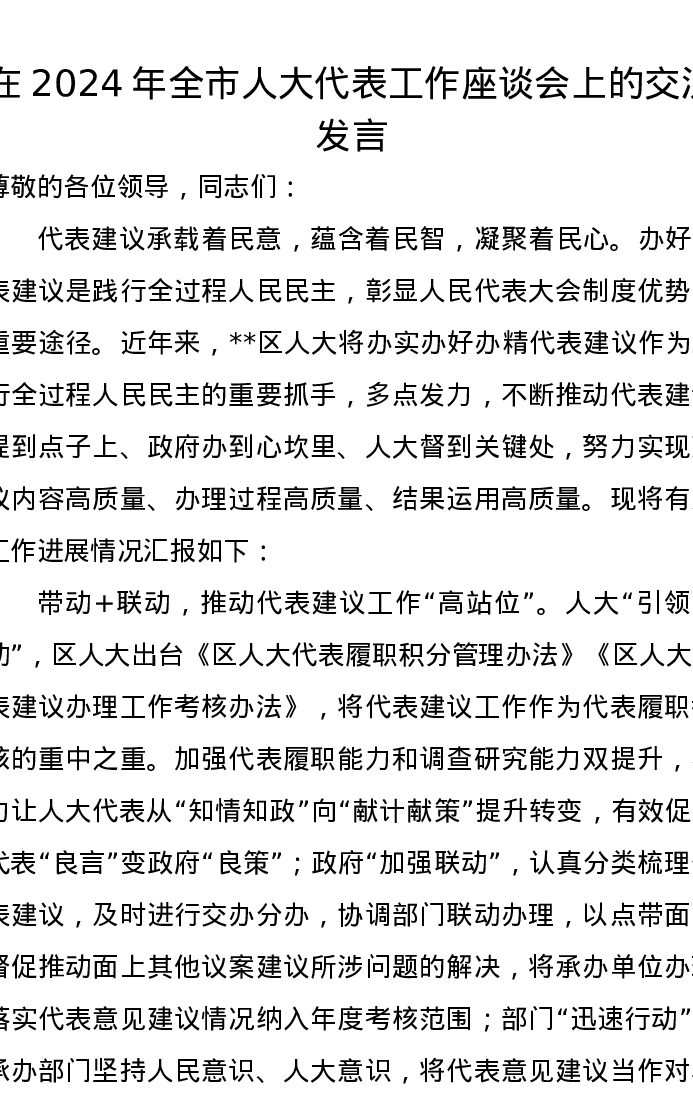 在2024年全市人大代表工作座谈会上的交流发言