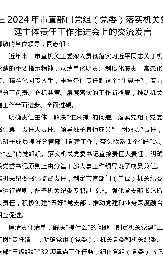 在2024年市直部门党组(党委)落实机关党建主体责任工作推进会上的交流发言