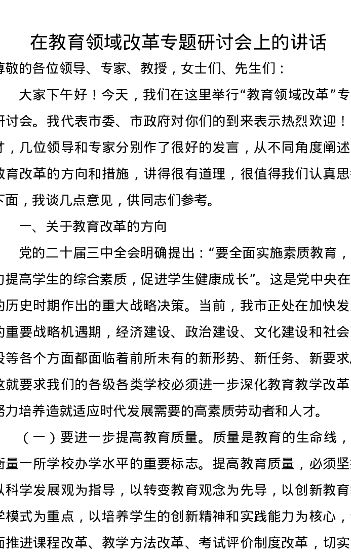 在教育领域改革专题研讨会上的讲话