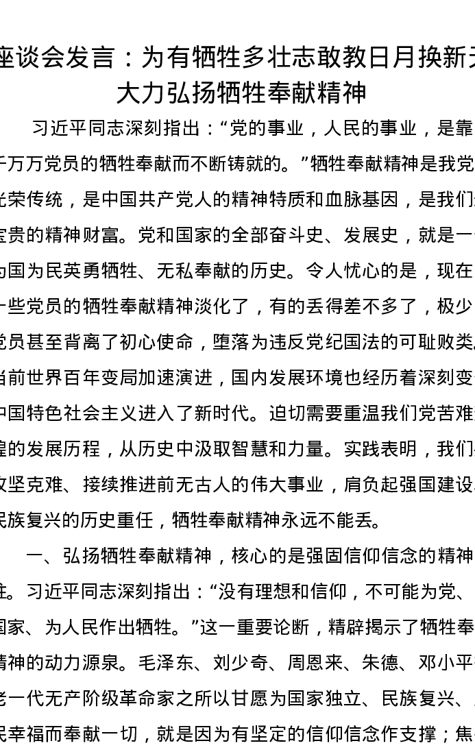 座谈会发言:为有牺牲多壮志敢教日月换新天大力弘扬牺牲奉献精神