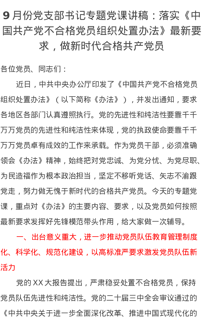 9月份党支部书记专题党课讲稿:落实《中国共产党不合格党员组织处置办法》最新要求,做新时代合格共产党员