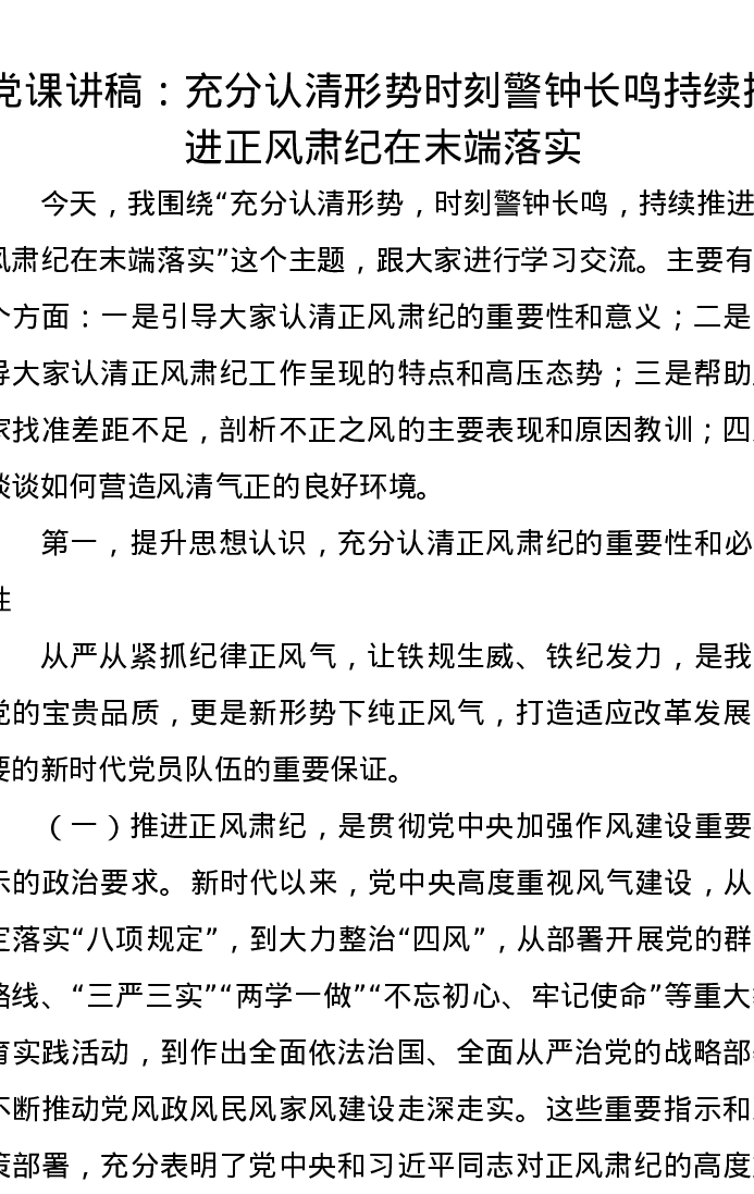 党课讲稿:充分认清形势时刻警钟长鸣持续推进正风肃纪在末端落实