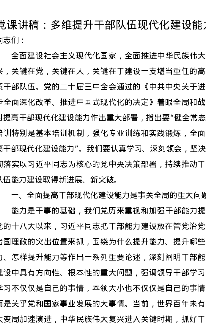 党课讲稿:多维提升干部队伍现代化建设能力