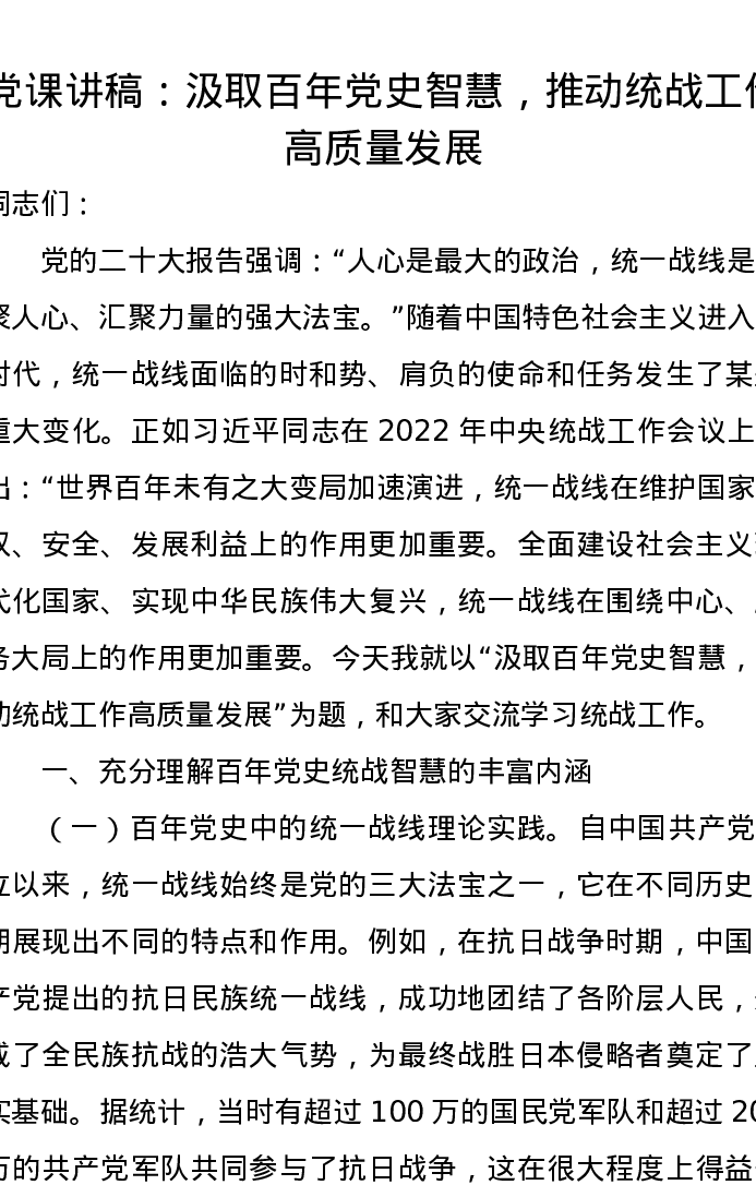 党课讲稿:汲取百年党史智慧,推动统战工作高质量发展