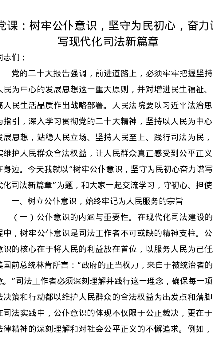 党课讲稿:树牢公仆意识,坚守为民初心,奋力谱写现代化司法新篇章