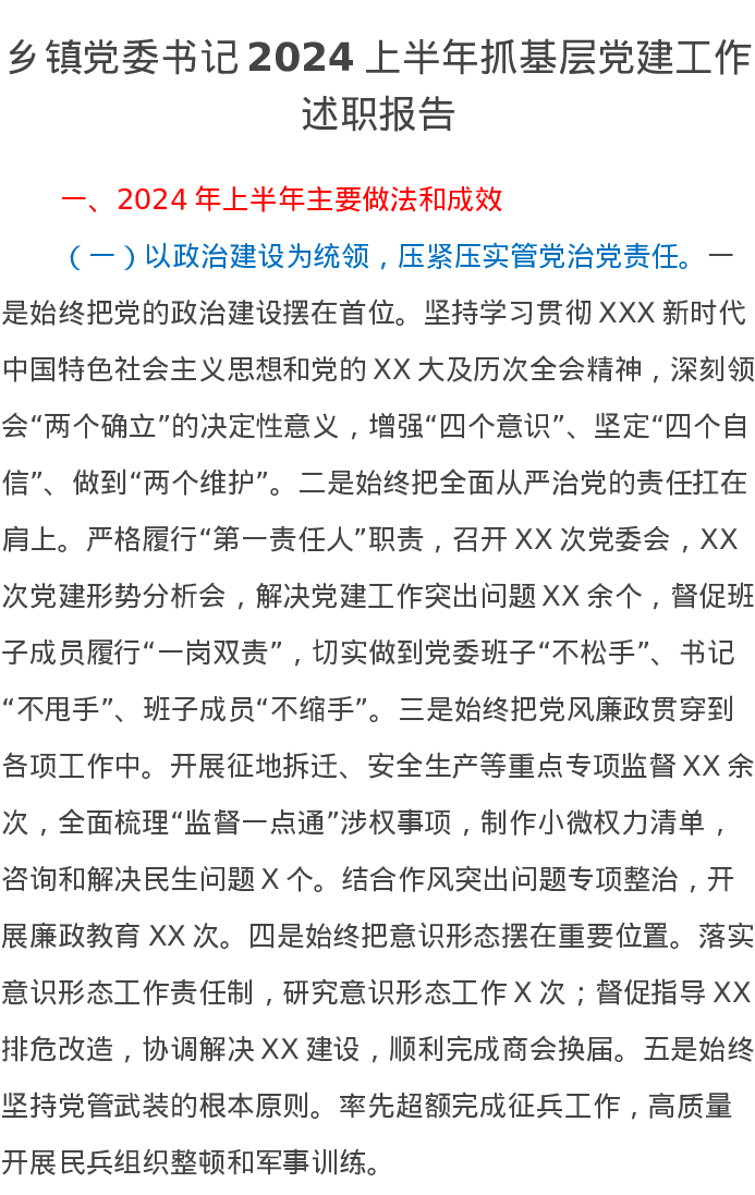乡镇党委书记2024上半年抓基层党建工作述职报告