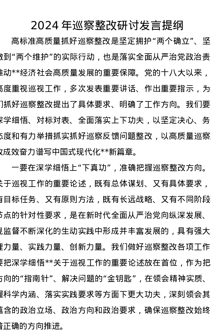 2024年巡察整改研讨发言提纲