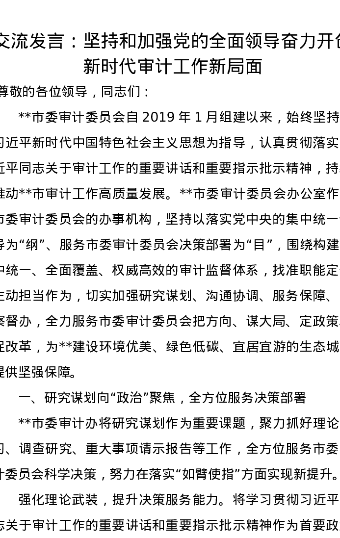 交流发言:坚持和加强党的全面领导奋力开创新时代审计工作新局面