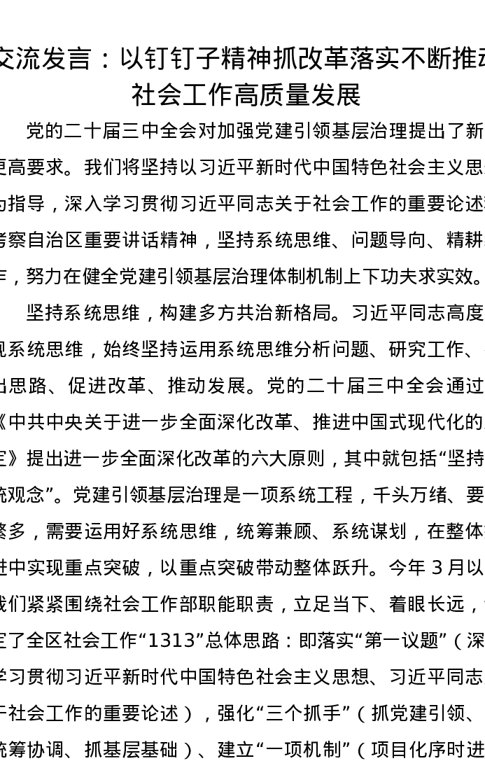 交流发言:以钉钉子精神抓改革落实不断推动社会工作高质量发展