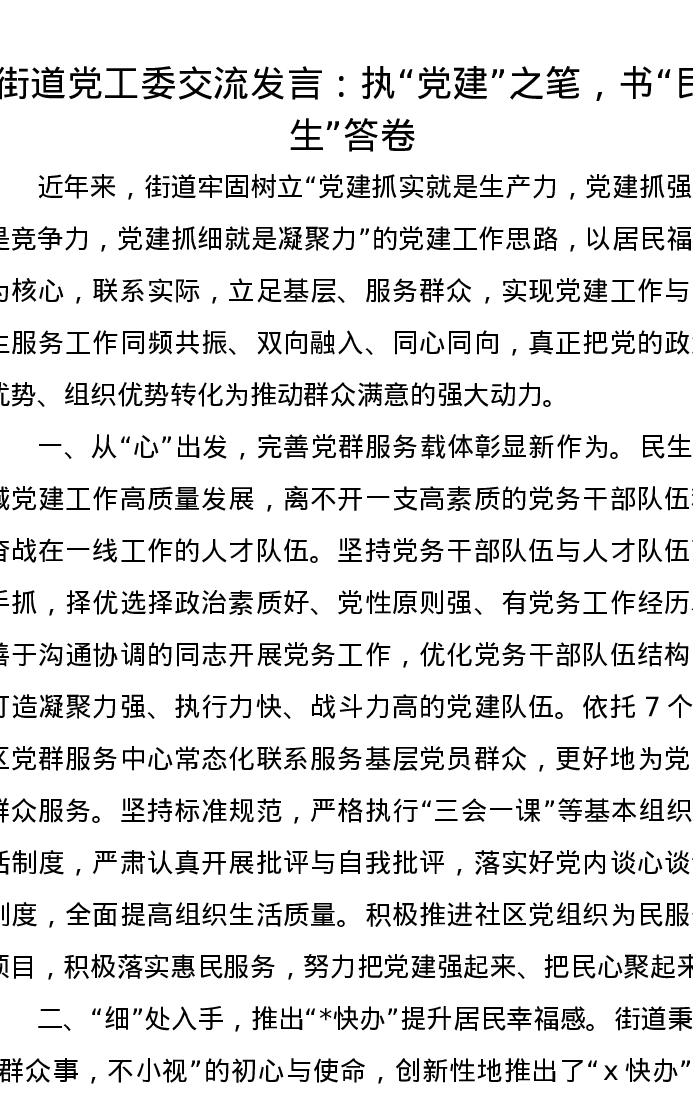 街道党工委交流发言:执“党建”之笔,书“民生”答卷