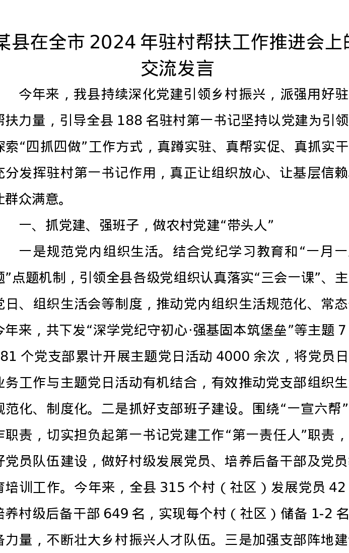 某县在全市2024年驻村帮扶工作推进会上的交流发言