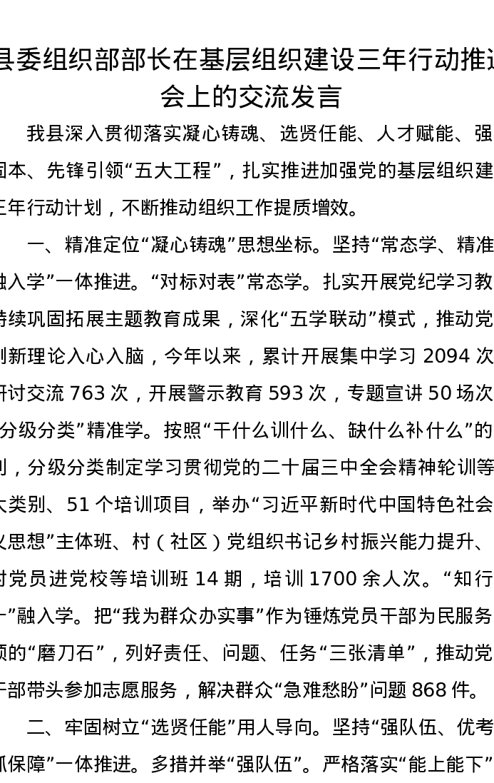 县委组织部部长在基层组织建设三年行动推进会上的交流发言