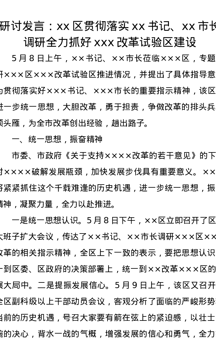 研讨发言:xx区贯彻落实xx书记、xx市长调研全力抓好xxx改革试验区建设