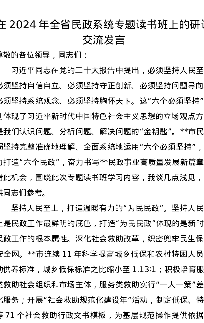在2024年全省民政系统专题读书班上的研讨交流发言