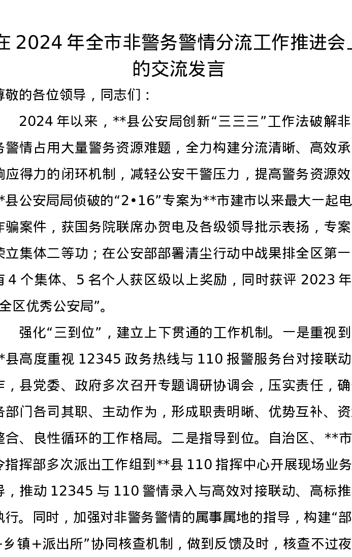 在2024年全市非警务警情分流工作推进会上的交流发言