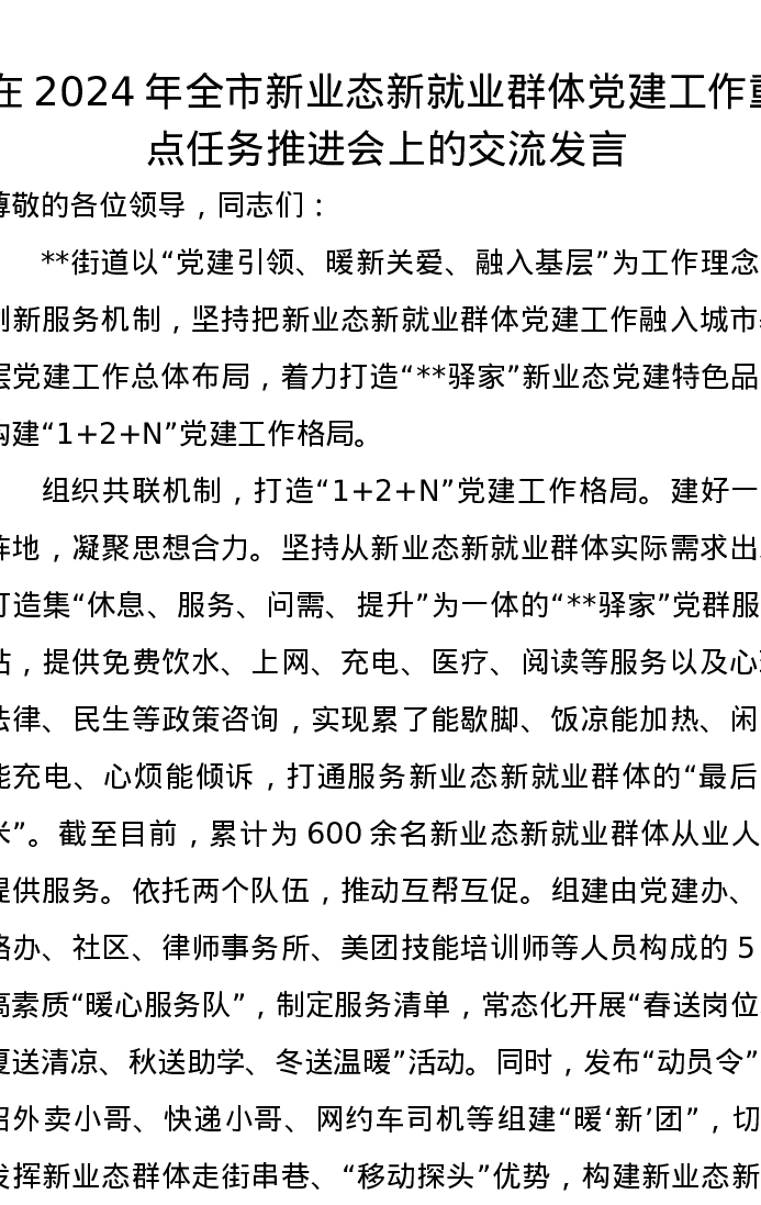 在2024年全市新业态新就业群体党建工作重点任务推进会上的交流发言