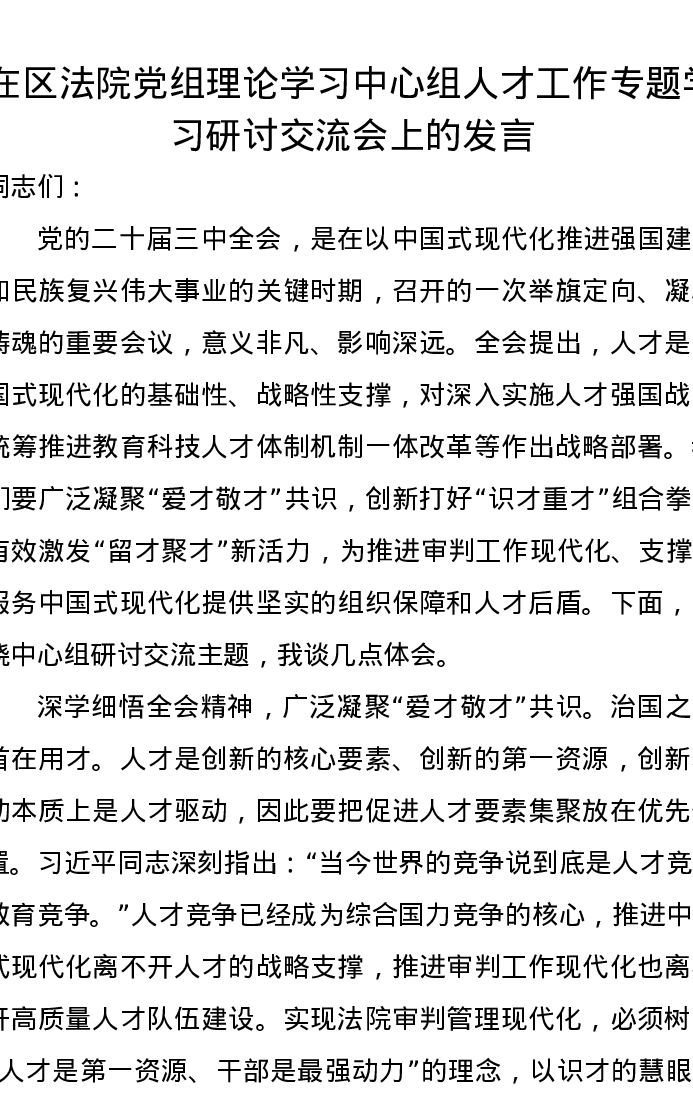 在区法院党组理论学习中心组人才工作专题学习研讨交流会上的发言