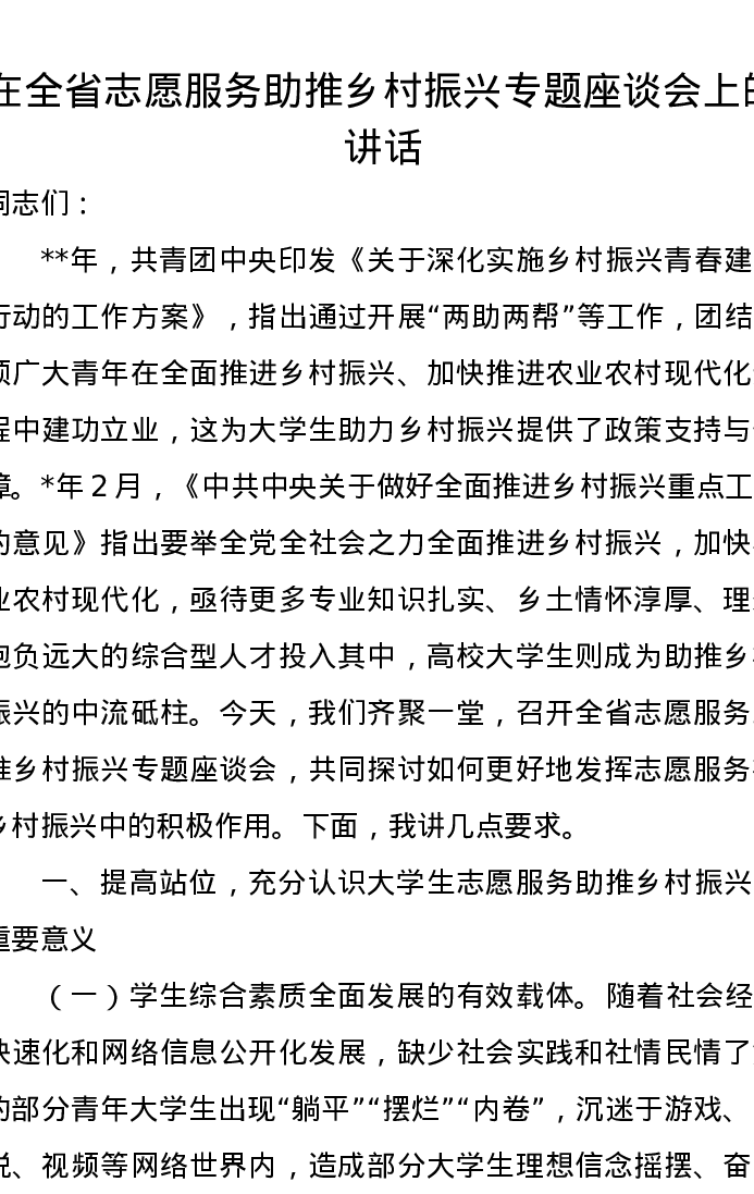 在全省志愿服务助推乡村振兴专题座谈会上的讲话