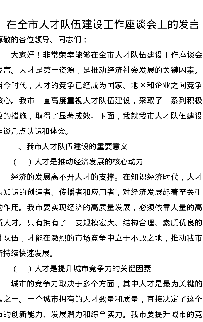在全市人才队伍建设工作座谈会上的发言