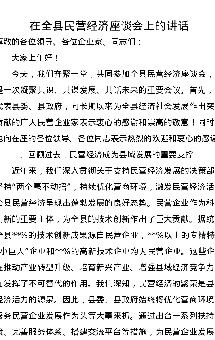 在全县民营经济座谈会上的讲话