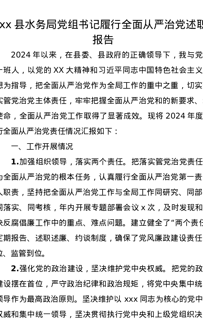 xx县水务局党组书记履行全面从严治党述职报告