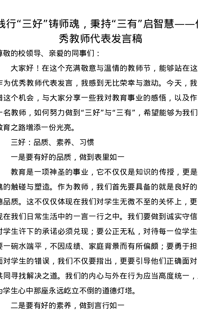 践行“三好”铸师魂,秉持“三有”启智慧——优秀教师代表发言稿