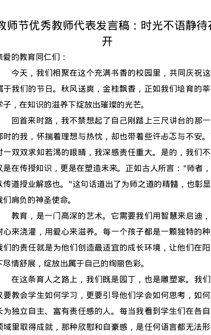 教师节优秀教师代表发言稿:时光不语静待花开