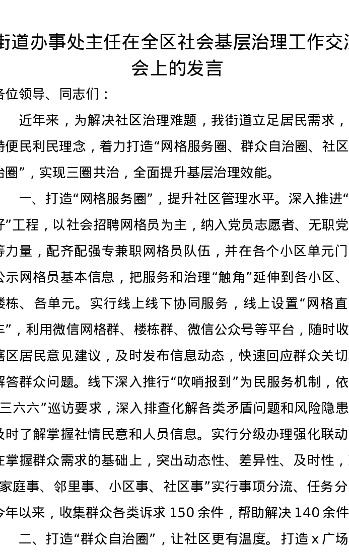 街道办事处主任在全区社会基层治理工作交流会上的发言