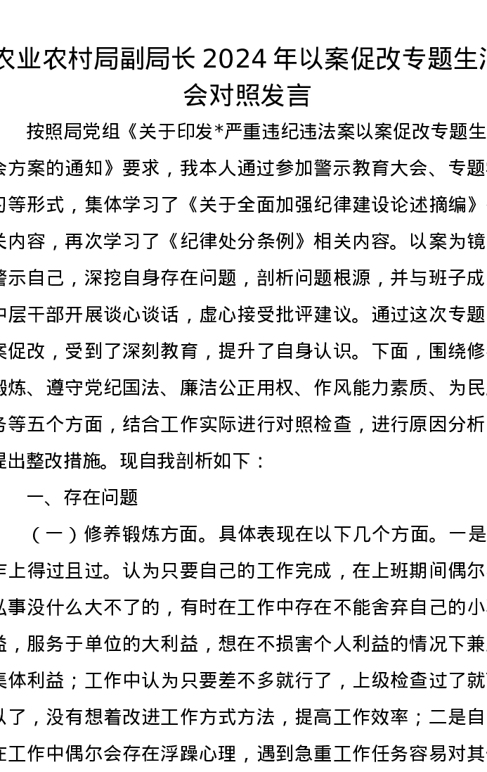 农业农村局副局长2024年以案促改专题生活会对照发言