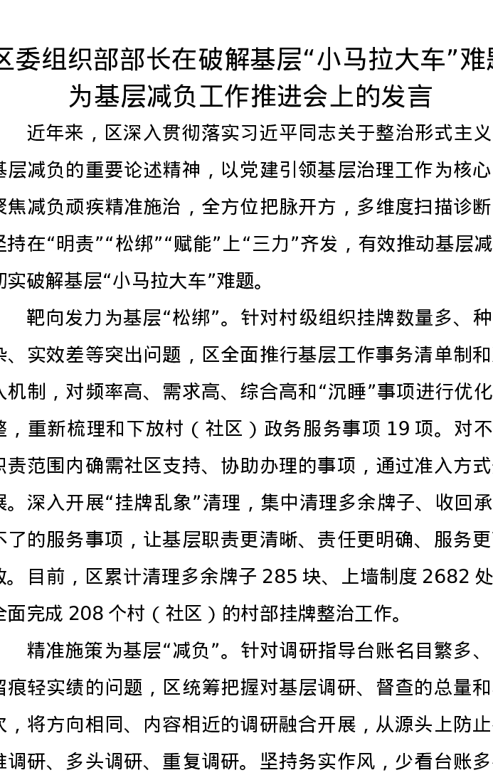 区委组织部部长在破解基层“小马拉大车”难题为基层减负工作推进会上的发言