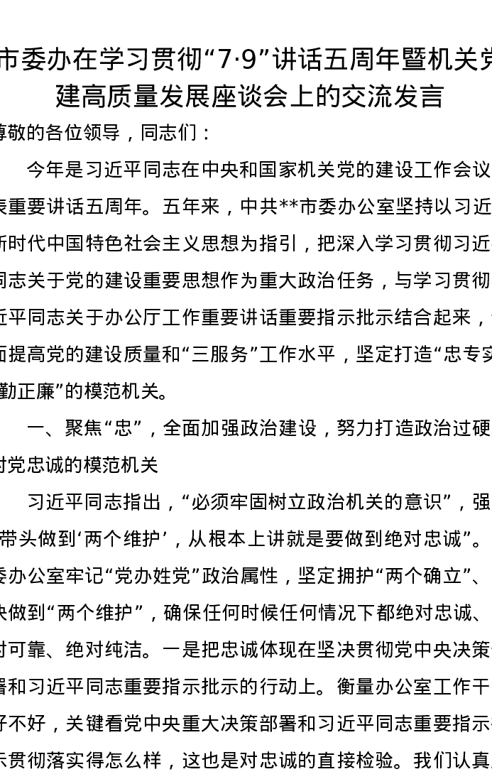市委办在学习贯彻“7·9”讲话五周年暨机关党建高质量发展座谈会上的交流发言