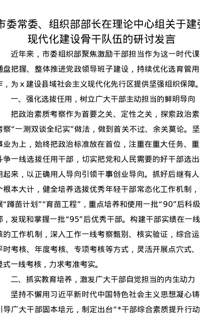 市委常委、组织部部长在理论中心组关于建强现代化建设骨干队伍的研讨发言