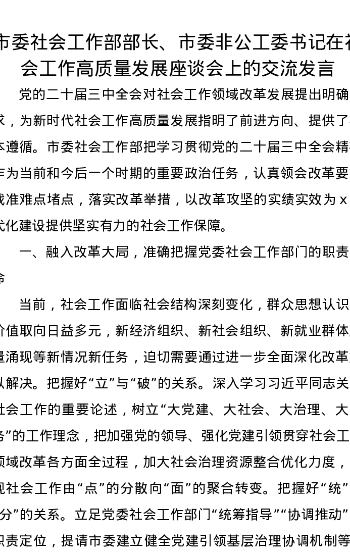 市委社会工作部部长、市委非公工委书记在社会工作高质量发展座谈会上的交流发言