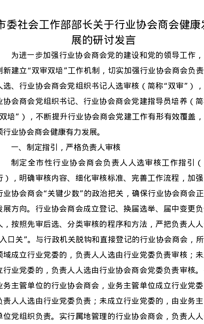 市委社会工作部部长关于行业协会商会健康发展的研讨发言