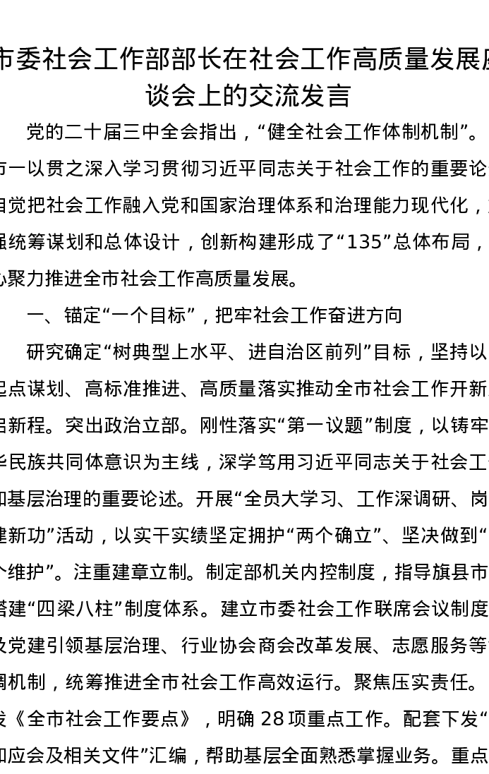 市委社会工作部部长在社会工作高质量发展座谈会上的交流发言